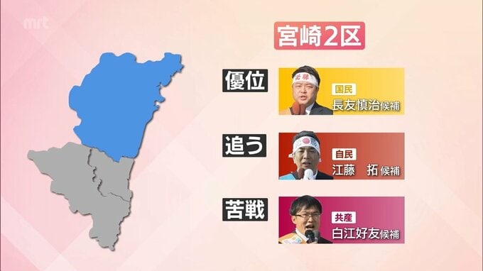 宮崎県内の選挙区のうち、宮崎2区では、国民民主党の長友氏が優位に進め、自民党の江藤氏が追う展開となっています。