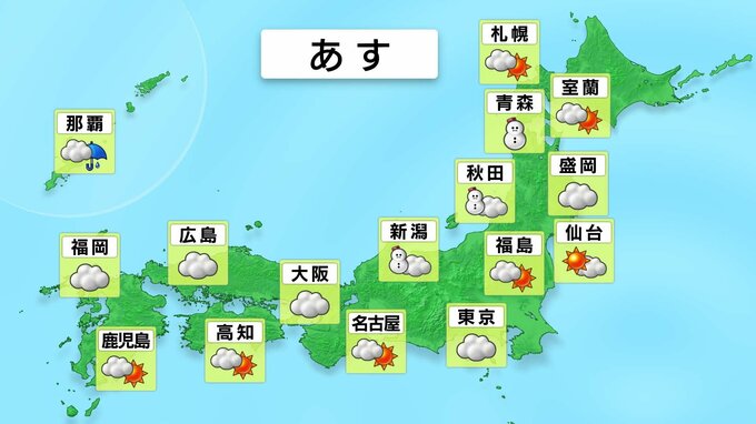 発達中の低気圧がオホーツク海を北東に進み、日本付近は強い冬型の気圧配置となる見込みです。北海道地方では、猛ふぶきや吹きだまりによる交通障害、暴風に、中国地方と近畿地方では、大雪による交通障害に警戒してください。また、北日本から西日本では大雪による交通障害に、全国的に強風や風雪、高波に注意・警戒してください。