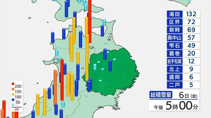 東北地方では、平年の積雪を上回っている所があり、特に北部では、平年の2倍以上となっている所もあります。9日頃にかけて、更に積雪が増える見込みです。東北日本海側を中心に7日昼過ぎから9日頃にかけて、大雪による交通障害、建物や農業施設への被害、屋根からの落雪に注意・警戒してください。電線や樹木への着雪、なだれにも注意してください。