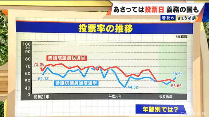 ただ、前回の衆議院選挙が53.85%、参議院選挙が58.51%となっています。直近3回の国政選挙を年齢別で見てみると…