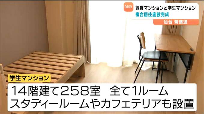 また、学生マンションは14階建てで258室、全て1ルームでスタディールームやカフェテリアなどもあります。どちらのマンションも東北エリア最大戸数だということです。