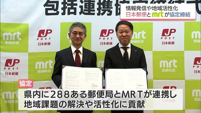 地域に根ざした取り組みを推進します。災害時の情報発信や地域活性化に協力して取り組もうと、日本郵便とMRT宮崎放送は包括連携協定を結びました。6日の締結式では、日本郵便の小池信也社長とMRTの松方健二社長が…