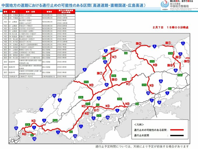 NEXCO西日本と中国地方整備局などは、大雪が見込まれる2月8日に、山陽道や中国道などの広範囲で予防的通行止めの可能性があると発表しました。