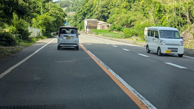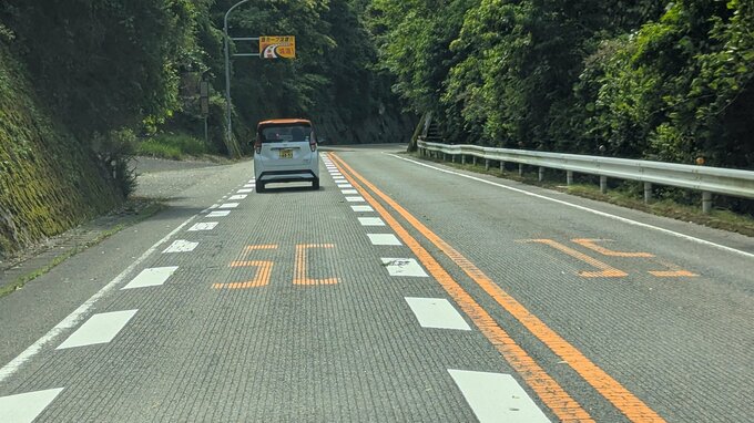 こちらには、いわゆる「はみ出し禁止」を意味するオレンジ色のセンターラインが二重に引かれている。