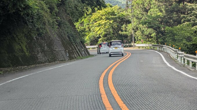 日本中、どこにでもありそうな、ちょっとカーブのきつい山道なのだが、ここにあるセンターラインの一部がちょっと妙な気がするのだ。