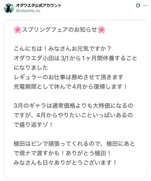 公式Xでは「スプリングフェアのお知らせ」とウキウキするようなタイトルの文書を掲載。小田さんがその文書を通じ、「こんにちは!みなさんお元気ですか?」「オダウエダ小田は3/1から1ヶ月間休養することになりました」と報告しました。