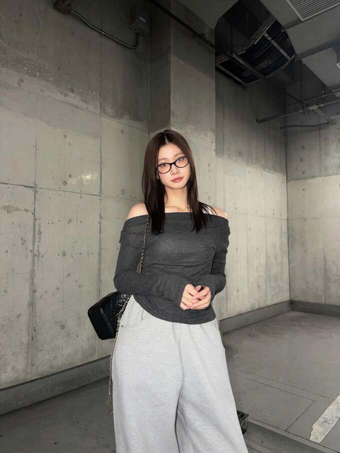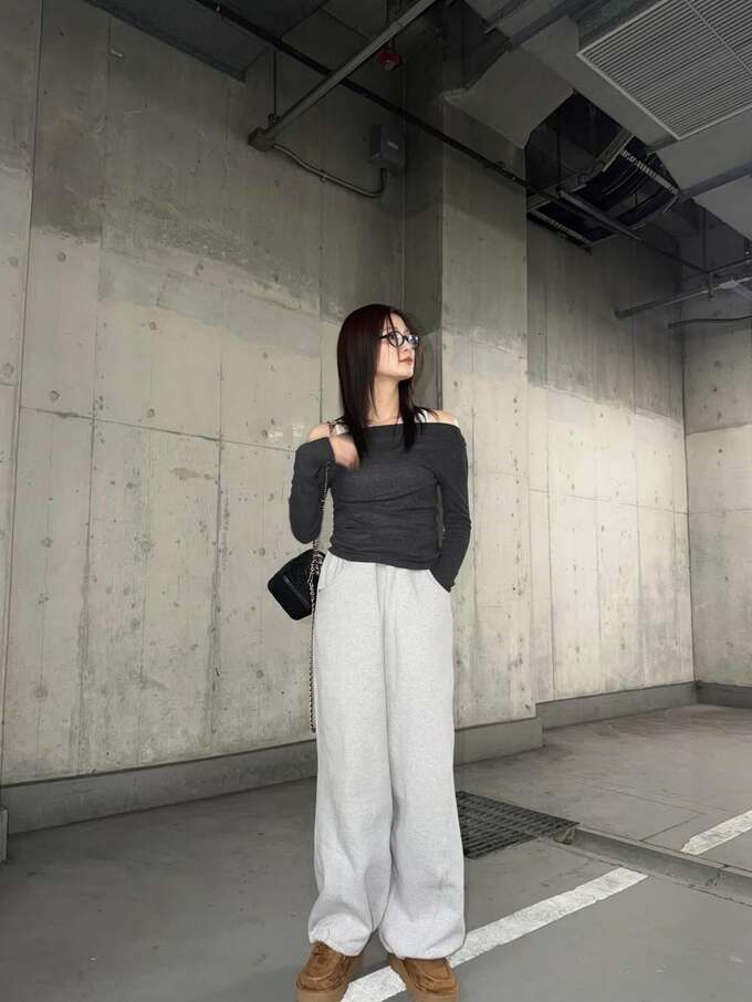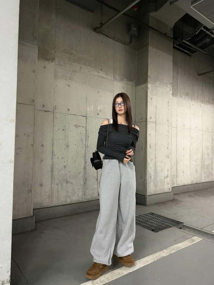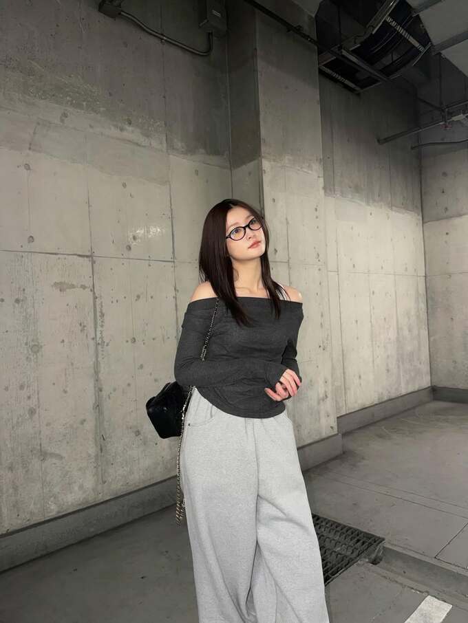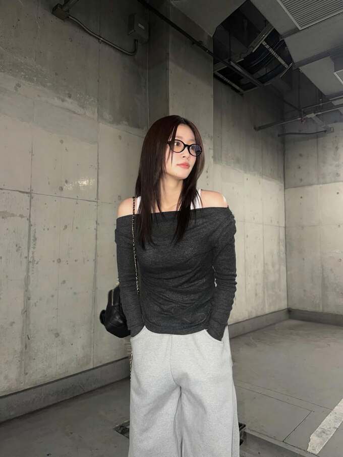 今回生見さんが選んだのは、デコルテを美しく見せる濃いグレーのオフショルダートップスと、淡いグレーのスウェットワイドパンツ。スウェット素材ながらも、肩の露出とボリュームのあるボトムスのコントラストが、彼女の抜群のスタイルをより一層引き立てる着こなしとなっています。