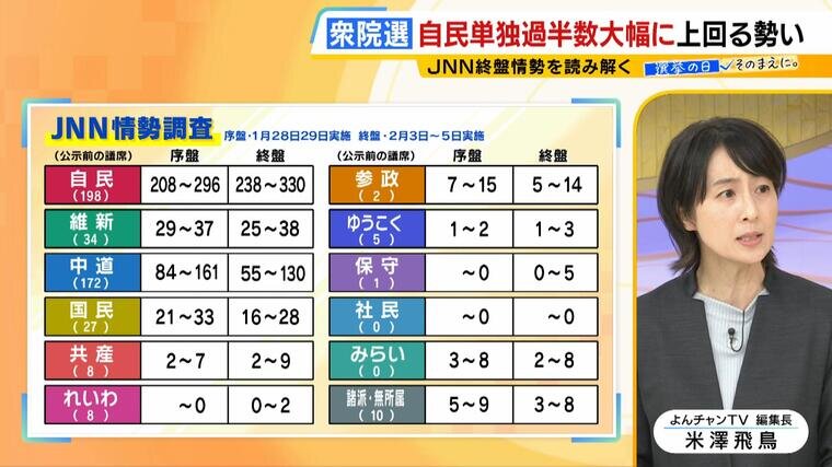 高市総理への支持を追い風に、自民党が単独で過半数を大幅に上回る勢いを見せる一方、野党の新党・中道改革連合の議席数は公示前から半減する可能性も出てきました。