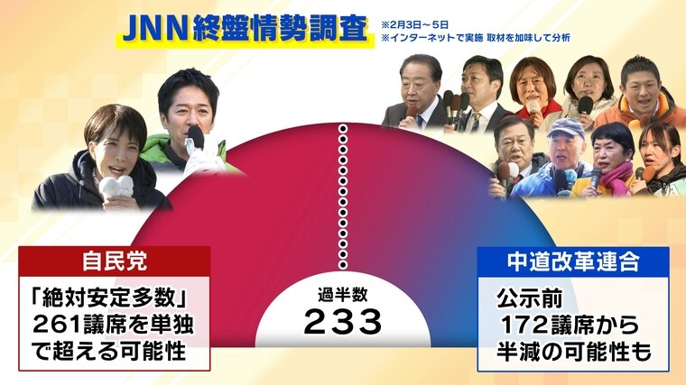JNNは2月3日~5日、インターネット調査を行い、取材を加味して終盤の情勢を分析しました。