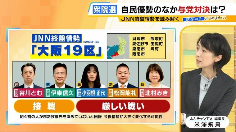 【最新選挙情勢】「自民」単独過半数大幅に上回る勢い 「中道」半減の可能性も 注目の『終盤情勢』関西の"激戦区"を深掘り解説/京都3区・京都6区・奈良1区・大阪7区・大阪19区【JNN終盤情勢】 毎日放送 2026年2月6日(金) 20:15 国内 【大阪19区】貝塚市、泉佐野市、泉南市、阪南市、泉南郡 さらに大阪19区でも、自民の元職・谷川とむさんと維新の前職・伊東信久さんが激しく競り合っています。 「谷川さんは幅広い年齢層から支持を集めているということがデータからわかっています。一方の伊東さんも維新支持層の6割強を固め、無党派層にも浸透していて維新の底堅い人気もみられますが、それを上回る自民への追い風がここでも吹いているようです」(MBS米澤編集長) 中道・新人の小羽根正代さん、参政・松岡能礼さん、共産・北村みきさんは厳しい戦いです。