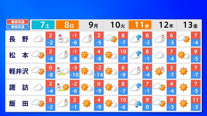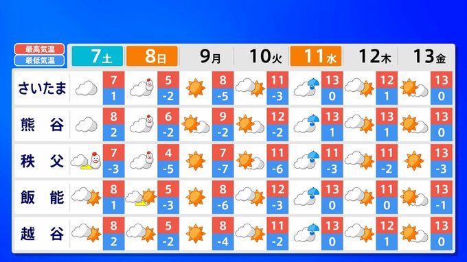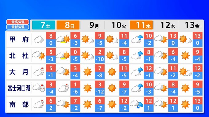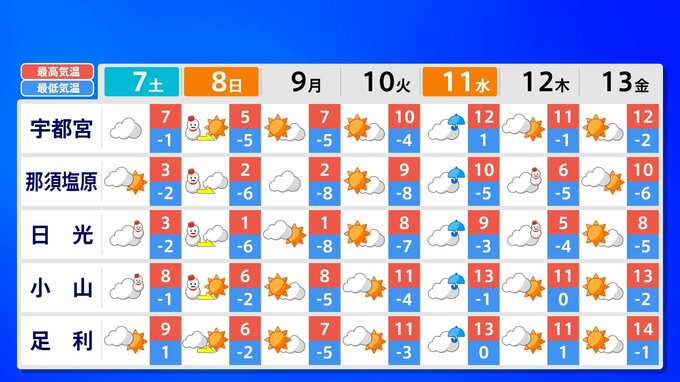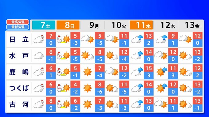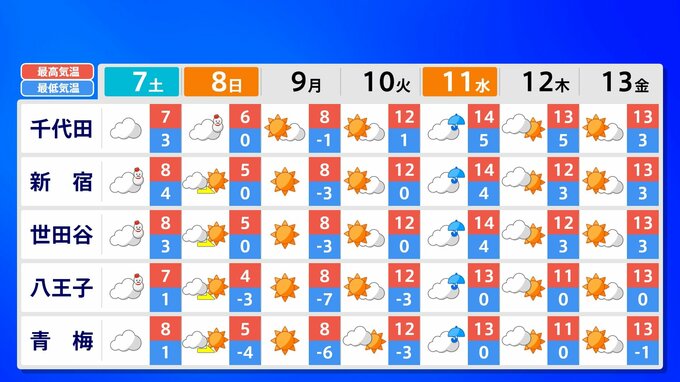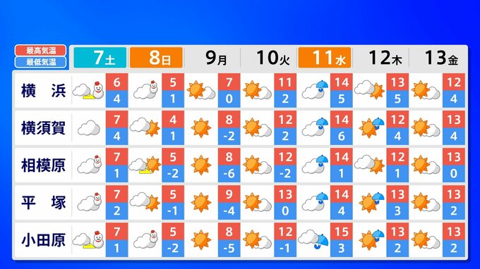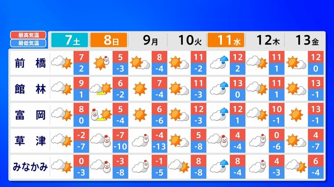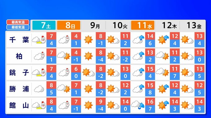 関東甲信地方 各都市の週間予報(7日(土)~ 13日(金))