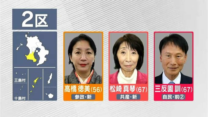 鹿児島2区では三反園さんが大きくリードし、高橋さんと松崎さんは厳しい戦いとなっています。無党派層が多いとも言われる鹿児島市南部での支持拡大がポイントになりそうです。