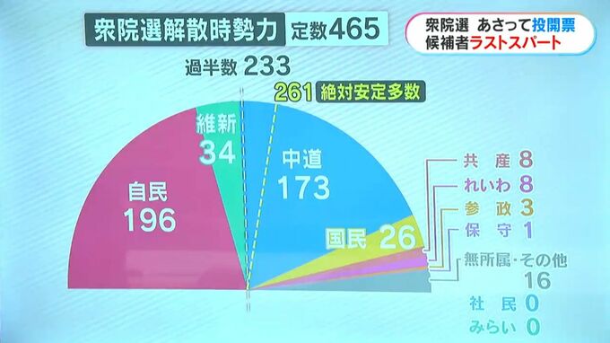 また、安定的な国会運営が可能になる「絶対安定多数」の261議席も単独で超える可能性があります。一方、中道は序盤情勢よりも失速し、解散時の173議席から半減する可能性もあります。