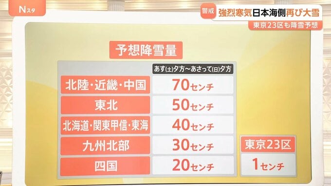 このように、北陸・近畿・中国は70センチの予想で、車の立ち往生などに注意が必要です。
