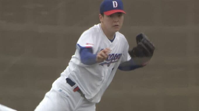 ドラフト1位の中西聖輝投手が対戦したのは石川昂弥選手と福永裕基選手。32球を投げ、ヒット性の当たりは6本。「打者のスイングが鋭く、高校時代との違いを痛感した」とプロのレベルを肌で感じた様子だが「通用する部分と足りない部分がはっきりした。低めへの制球力を磨きたい」と収穫と課題を冷静に分析した。