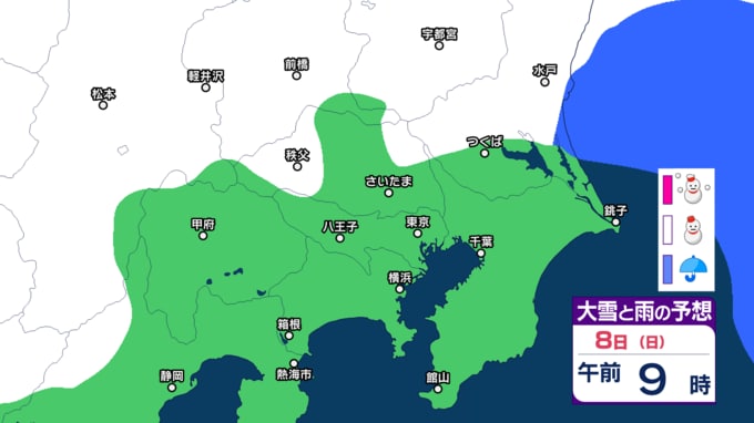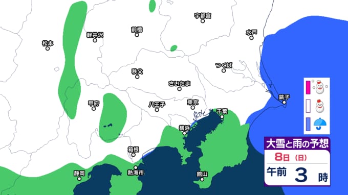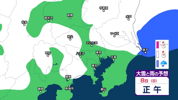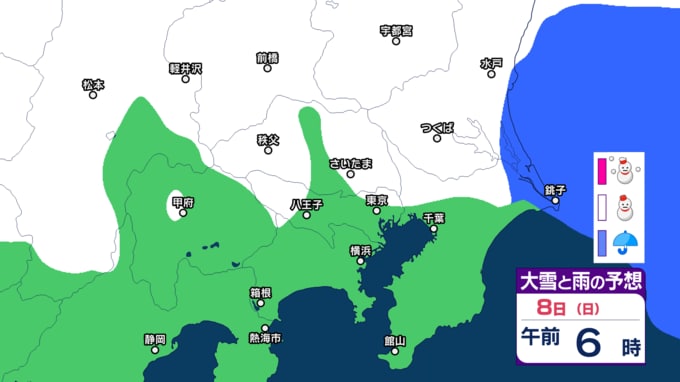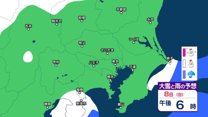 【雪】東京・栃木・群馬・埼玉・茨城・千葉・神奈川・長野・山梨 6日(金)~11日(祝)の雪雨シミュレーション【気象庁/2月6日午後 関東甲信 雪の予想】 RSK山陽放送 2026年2月6日(金) 20:47 国内 8日(日) 気象庁によりますと、 8日18時から9日18時までに予想される24時間降雪量は多い所で、 関東地方北部の山地 40センチ 関東地方北部の平地 1センチ 甲信地方 30センチ でしょう。 11日(水)までの雪雨シミュレーション 11日は広範囲で雨か 11日(水)までの雪雨シミュレーション