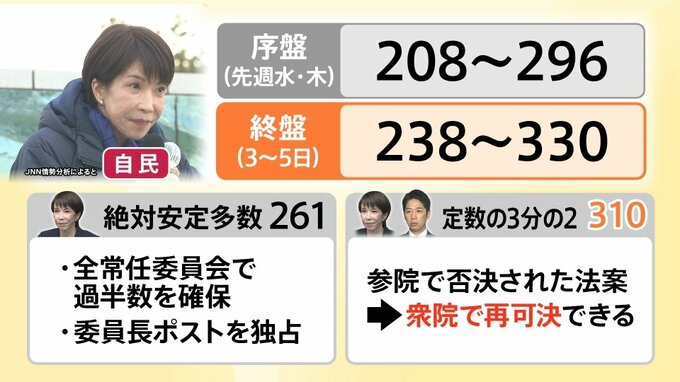 自民単独で絶対安定多数の「261議席」、さらに自民・維新を合わせた与党で議員定数の3分の2となる「310議席」を確保できれば、自民党として政策の議論はスムーズになります。
