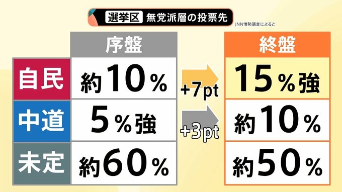 「未定」が10ポイント減少した分、自民は約7ポイント、中道が約3ポイント増えています。無党派層の投票先を決めた人の半分以上が「自民にしよう」と決めたということです。それだけ追い風が強くなっているということだと思います。