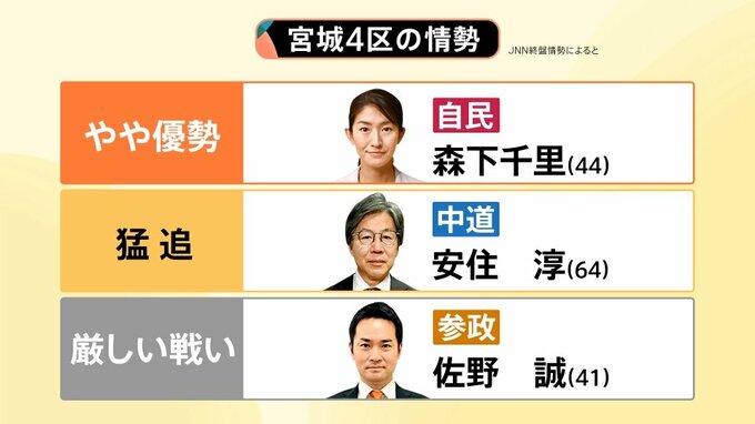 各メディアが象徴的な選挙区として挙げているのが「宮城4区」。3人の候補が熾烈な争いを繰り広げています。