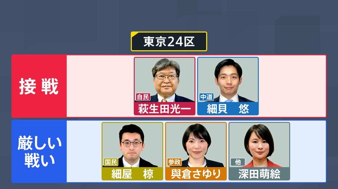 東京24区では、序盤情勢では自民党の萩生田光一氏が「やや優勢」だったが、終盤では中道の細貝悠氏が差を詰めて「接戦」となっている。これには公明党の支援が影響しており、勝敗がどうなるか、公明党支持層の投票動向が注目されている。