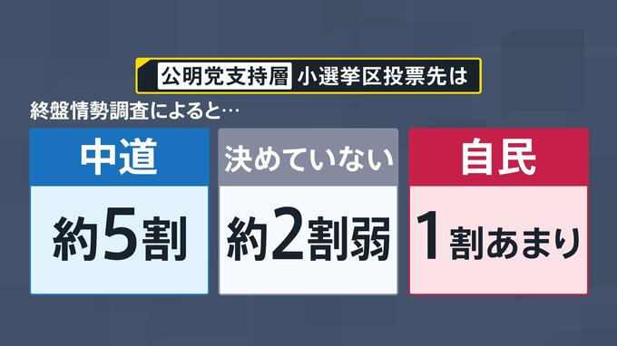調査では、公明党支持層に小選挙区での投票先について聞いたところ、中道への投票意向が約5割となっていて、序盤情勢の約4割から増加している。一方、まだ2割弱が「決めていない」状況だという。市澤デスクは「週末にかけて、この決めてない約2割の公明党支持層がどう動くか。これが接戦、横一線の選挙区には特に大きなファクターになる」と述べた。