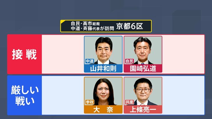 特に注目されるのは、自民党の高市総裁と中道の斉藤共同代表の両党首が立て続けに訪問した京都6区。この選挙区では、中道の山井和則氏と自民党の園崎弘道氏が接戦を繰り広げている。