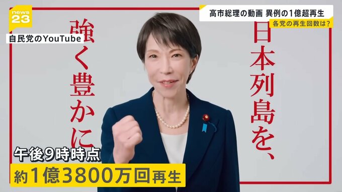 自民党が衆院選公示前にYouTubeに投稿した高市総理の動画の再生回数が1億回を超えました。他党の再生回数と比較しても、異例の数字となっています。