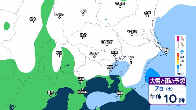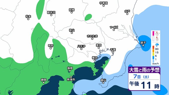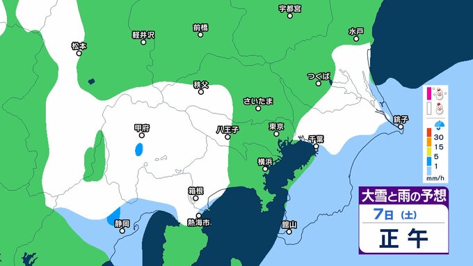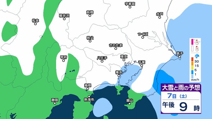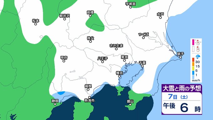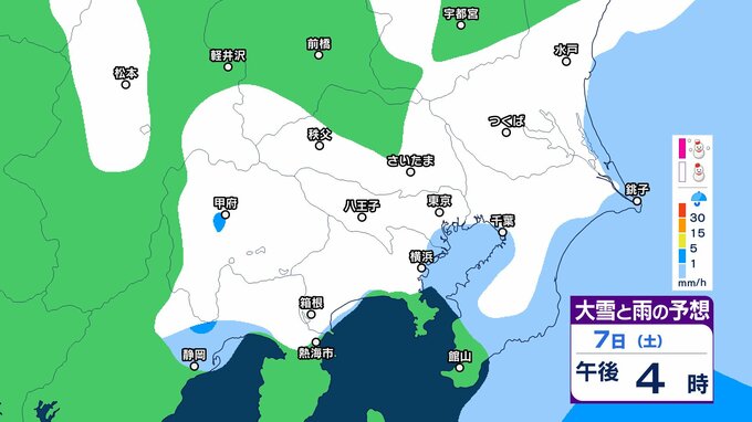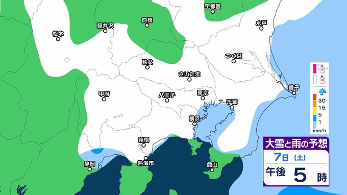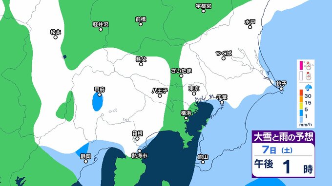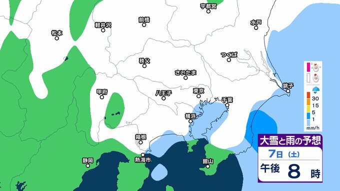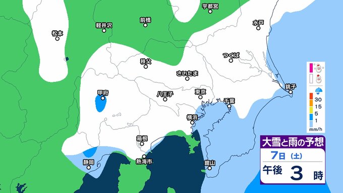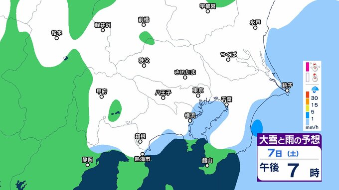 このため、関東甲信地方では7日昼過ぎから8日夜遅くにかけて広い範囲で雪や雨が降り、山沿いや山地を中心に、平地や伊豆諸島でも大雪となる所があるとしています。