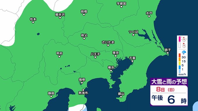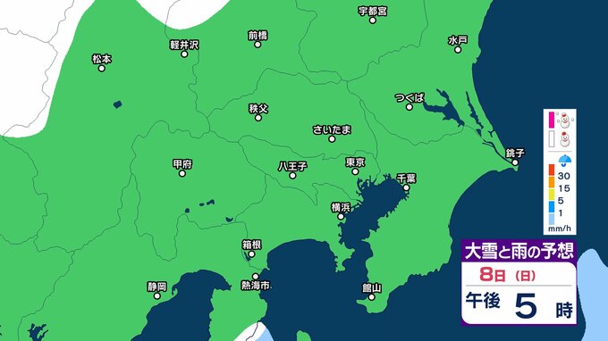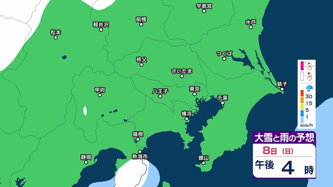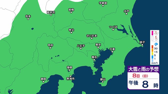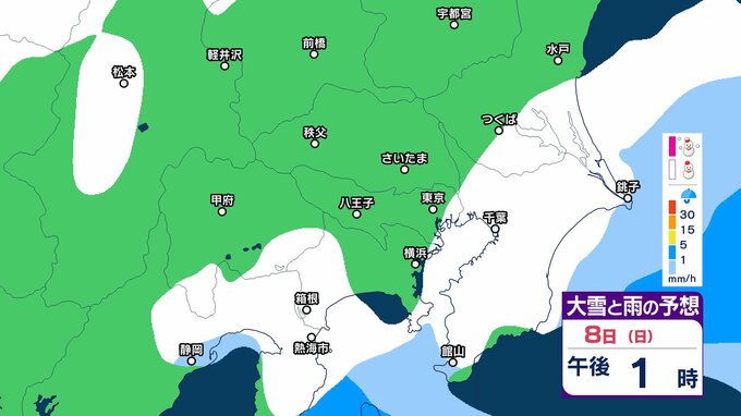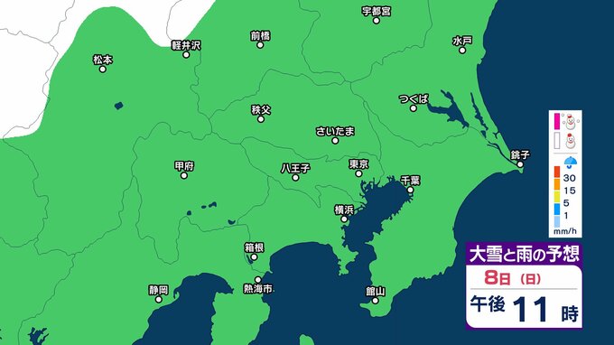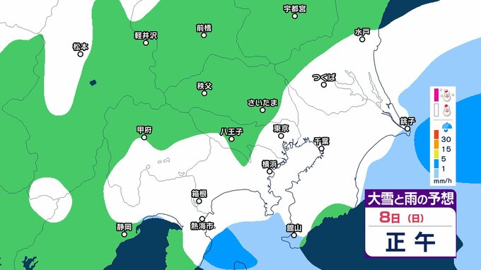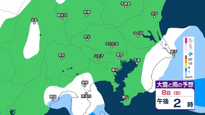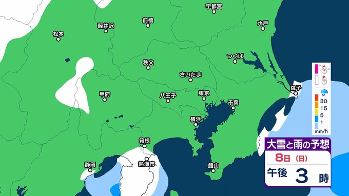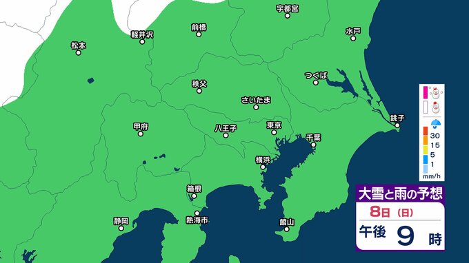 【雪の予想】東京・栃木・群馬・埼玉・茨城・千葉・神奈川・長野・山梨 7日(土)~9日(月)1時間ごとの雪雨シミュレーション「関東南部の平地で10センチ積雪予報」【気象庁/2月7日午前9時更新 関東甲信】 RSK山陽放送 2026年2月7日(土) 09:45 国内 8日(日)午後は? 7日(土)~9日(月)の1時間ごとの雪雨シミュレーション 7日(土)~9日(月)の1時間ごとの雪雨シミュレーション