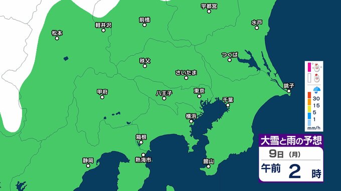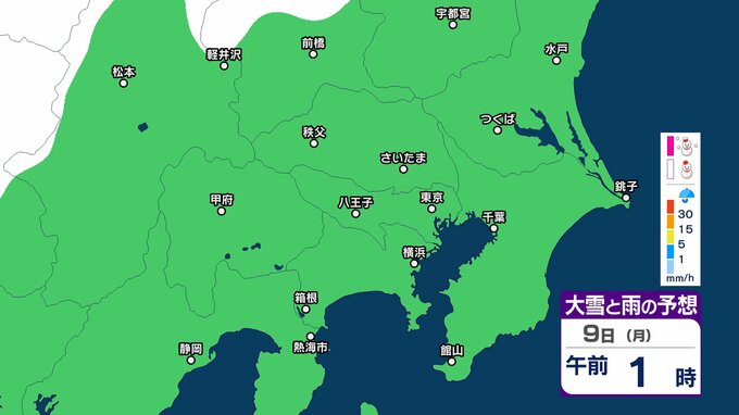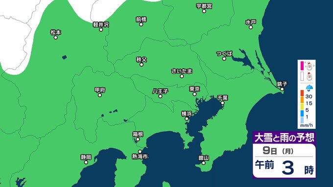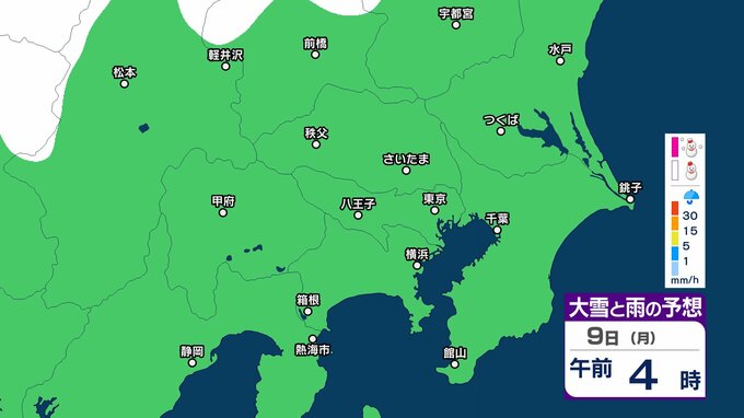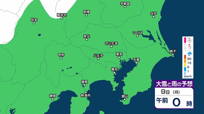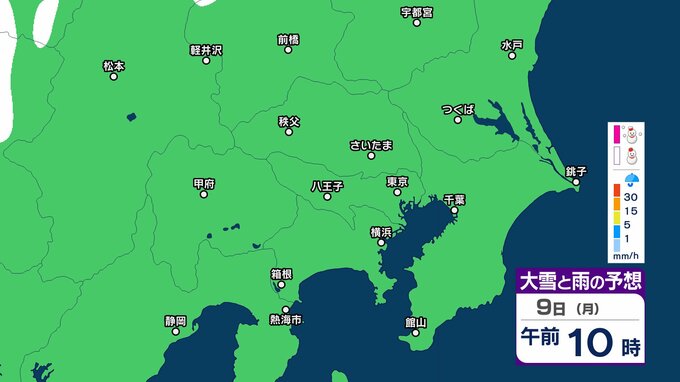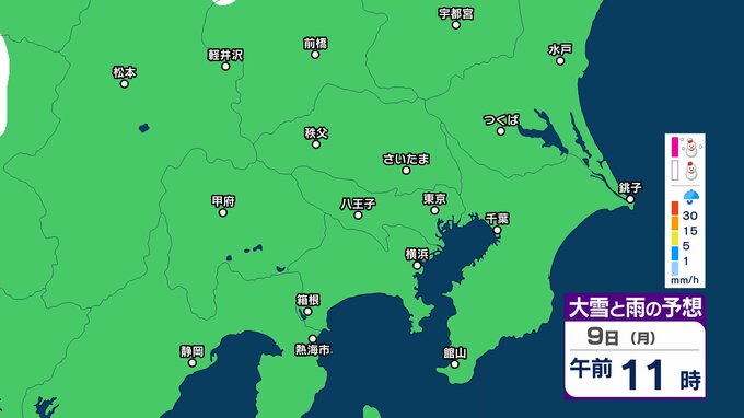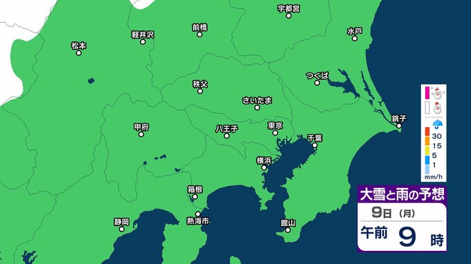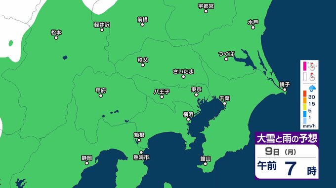 【雪の予想】東京・栃木・群馬・埼玉・茨城・千葉・神奈川・長野・山梨 7日(土)~9日(月)1時間ごとの雪雨シミュレーション「関東南部の平地で10センチ積雪予報」【気象庁/2月7日午前9時更新 関東甲信】 RSK山陽放送 2026年2月7日(土) 09:45 国内 9日(日) 7日(土)~9日(月)の1時間ごとの雪雨シミュレーション 7日(土)~9日(月)の1時間ごとの雪雨シミュレーション