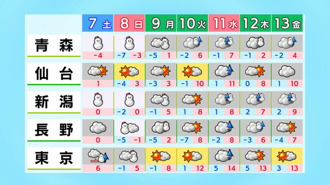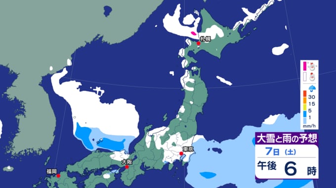 特に8日(日)は、上空に一層強い寒気が流れ込むため、降雪が強まるおそれがあり、普段雪の少ない太平洋側でも大雪となる所がある見込みです。