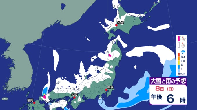 中国地方と近畿地方では、8日(日)は大雪による交通障害に警戒し、北日本から東日本では大雪による交通障害に注意・警戒してください。
