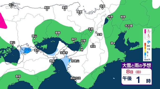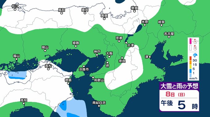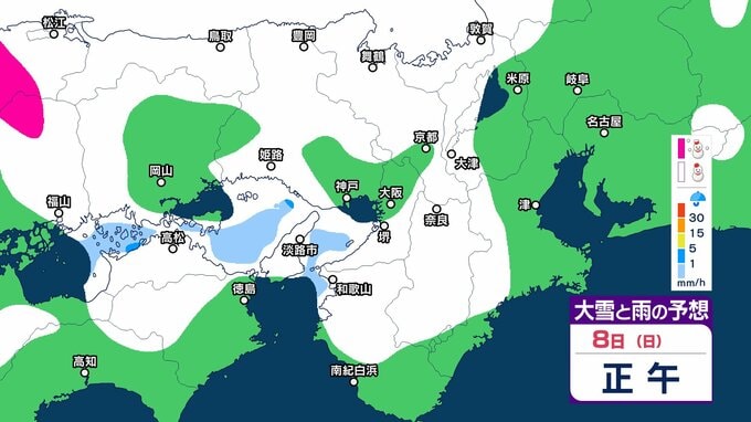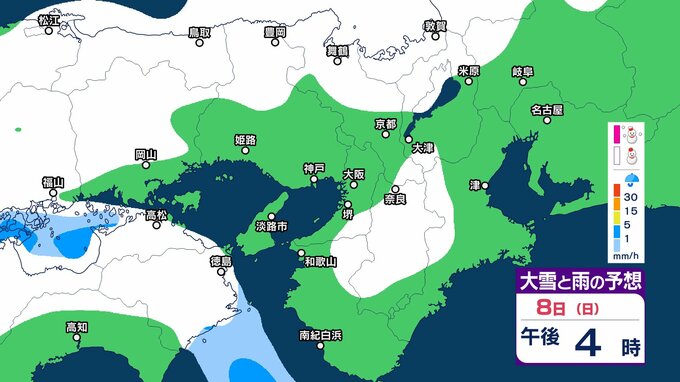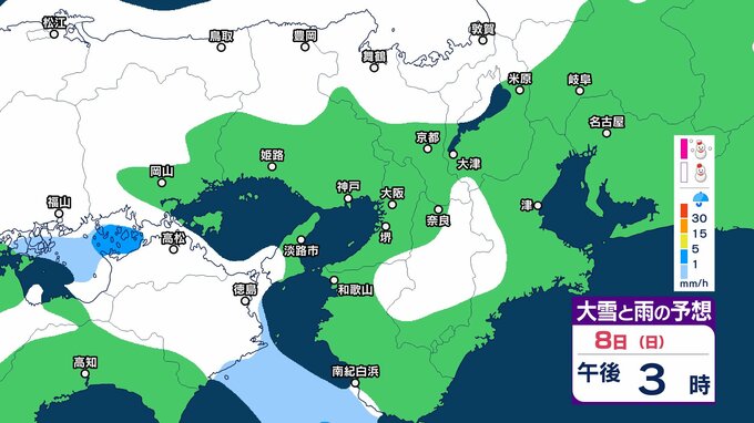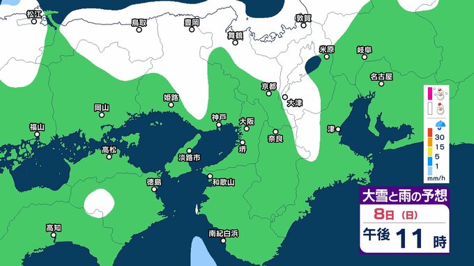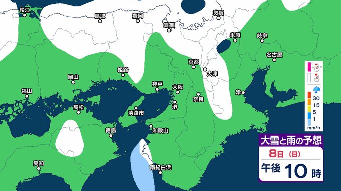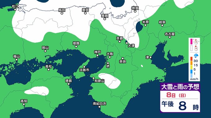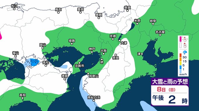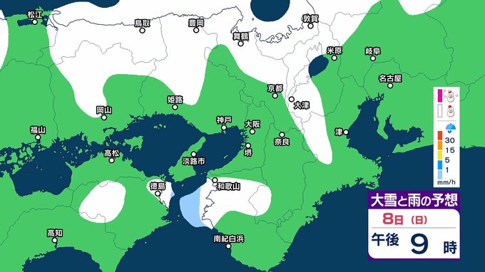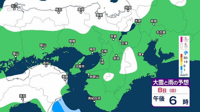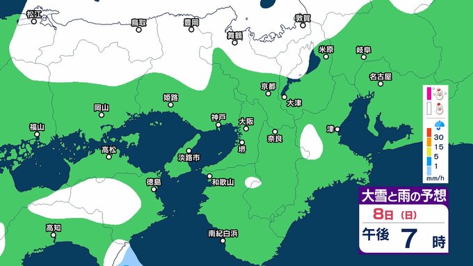 近畿地方では、7日夜のはじめ頃から9日午前中にかけて大雪となるということです。特に、8日明け方から夜のはじめ頃は短時間に降雪が強まり、警報級の大雪となる見込みです。