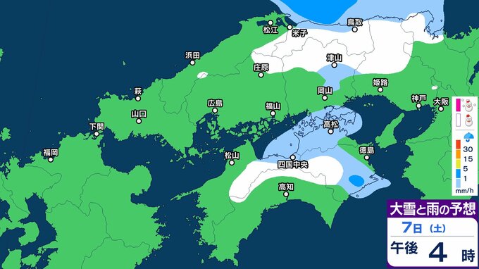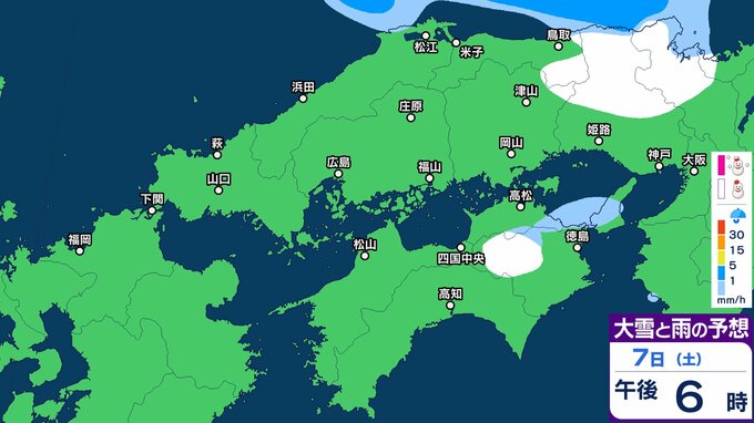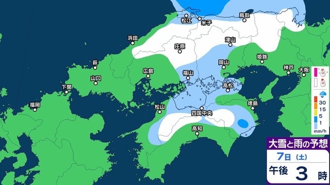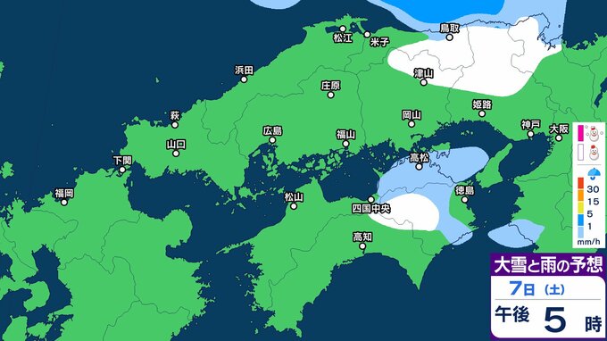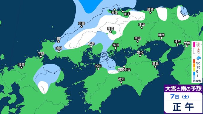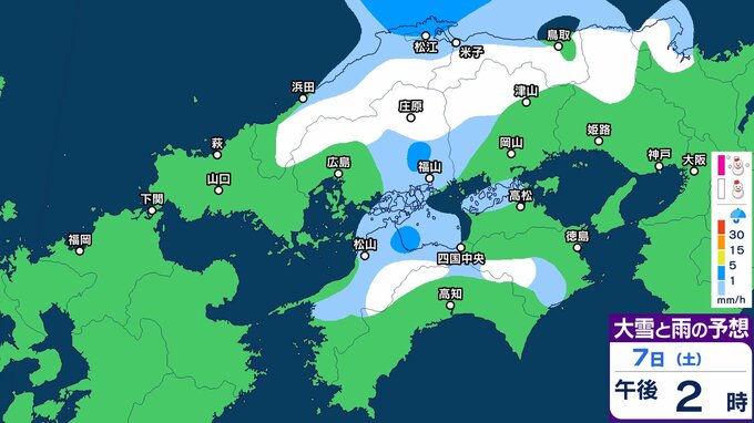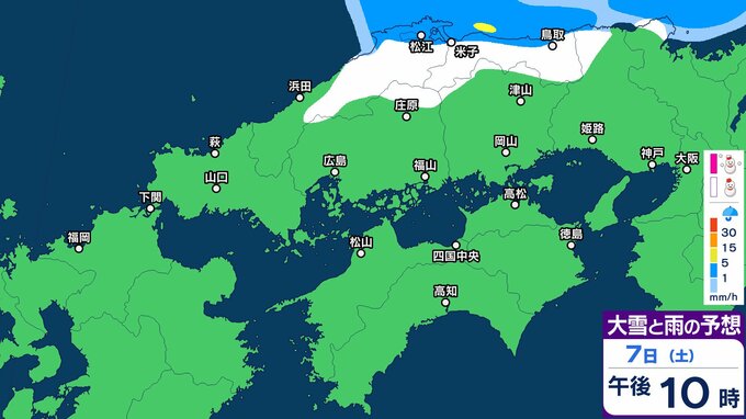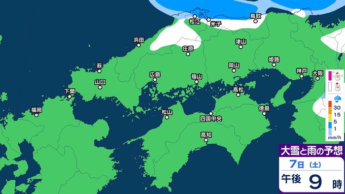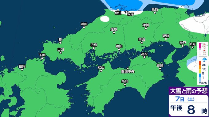 中国地方では、短時間に降雪が強まり、8日明け方から夜のはじめ頃にかけて平地も含めた広い範囲で警報級の大雪となる見込みです。