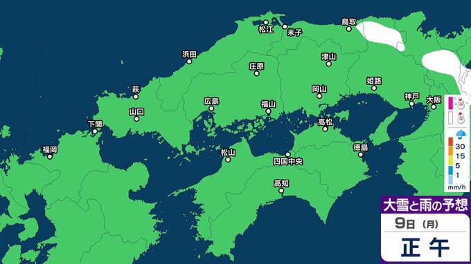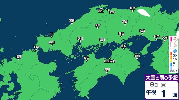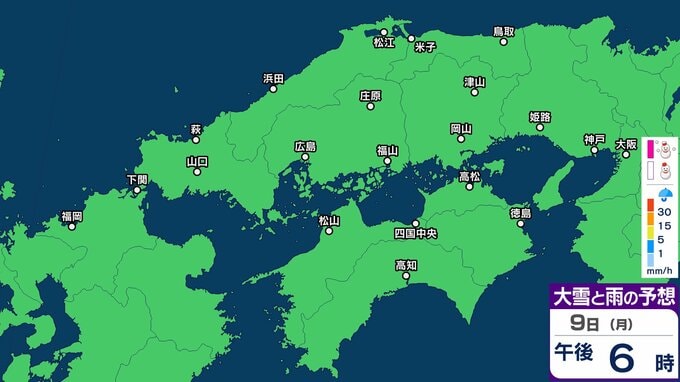 【中国地方の雪の予想】広島・岡山・山口・鳥取・島根 2月7日(土)~9日(月)1時間ごとの雪雨シミュレーション【気象庁 7日正午更新】 RSK山陽放送 2026年2月7日(土) 12:18 国内 9日(月)午後 ▶7日(土)~9日(月)中国・四国地方の雪雨シミュレーション画像 ▶7日(土)~9日(月)中国・四国地方の雪雨シミュレーション画像 ※GSM(シミュレーション)は比較的大まかに雨・雪雲を予想する傾向があるため、局地的には雨・雪が降らないこともあります。予想にはブレ幅がありますので、最新の気象情報を確認してください。