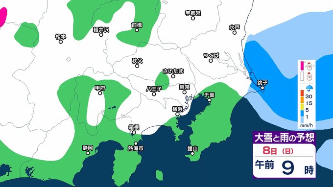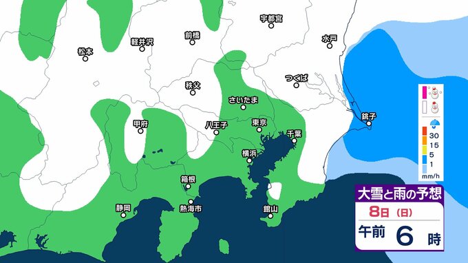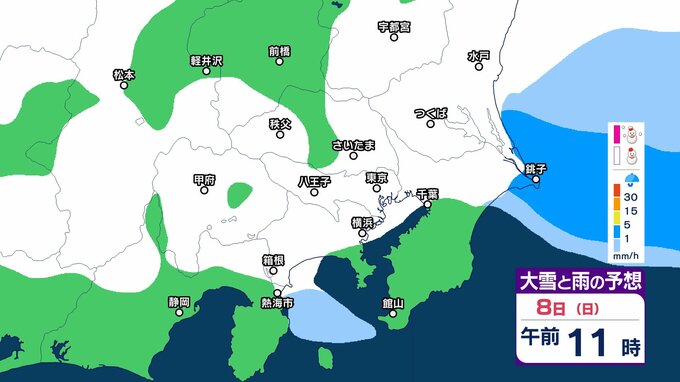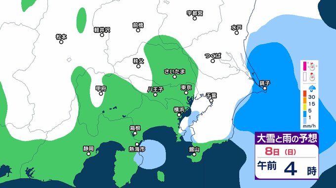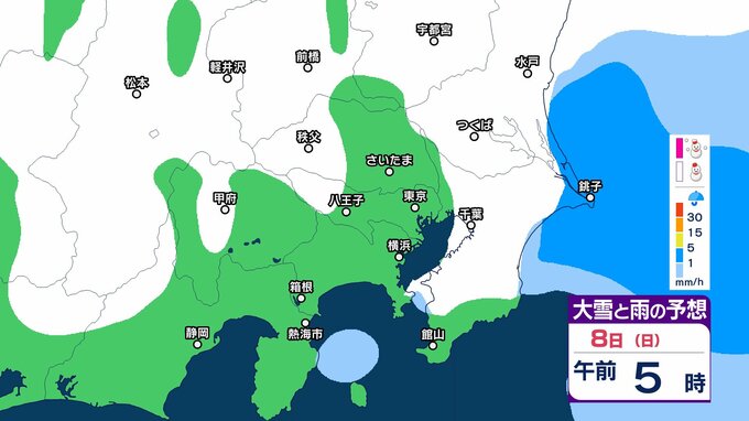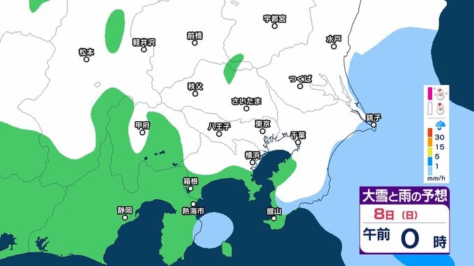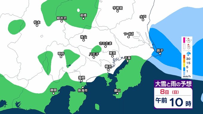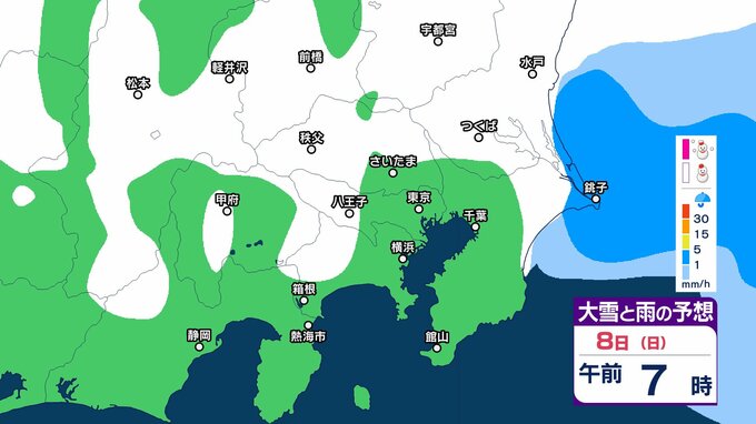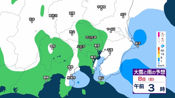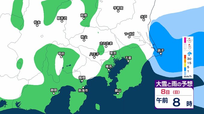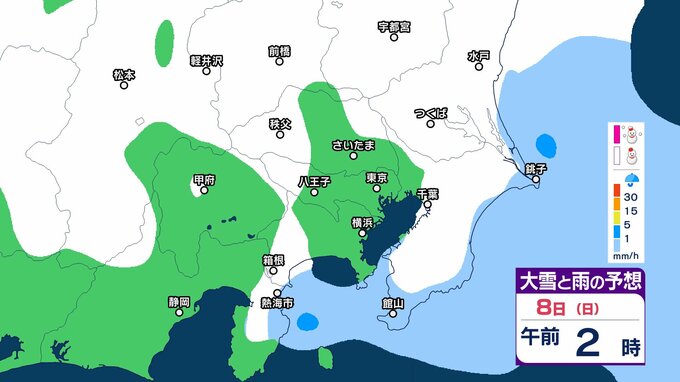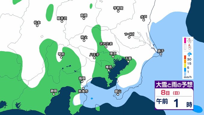 このため、関東甲信地方では8日夜遅くにかけて広い範囲で雪や雨が降り、山沿いや山地を中心に、平地や伊豆諸島でも大雪となる所があるということです。