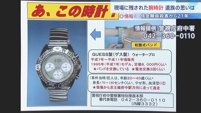 1995年モデルの『GUESS』製の腕時計。伸縮式のバンドに付け替えられたものでしたが、このバンド部分からは男のものとみられるDNA型が検出されています。血液型はO型でした。