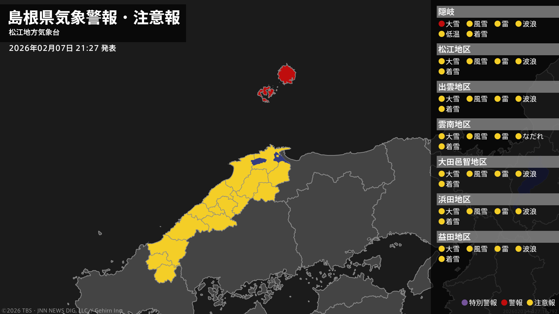 気象台は、午後9時27分に、大雪警報を海士町、西ノ島町、知夫村、隠岐の島町に発表しました。