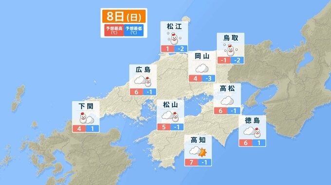 四国地方では、8日明け方から9日午前中にかけて、山地を中心に大雪となり、平地でも大雪となる所があるでしょう。