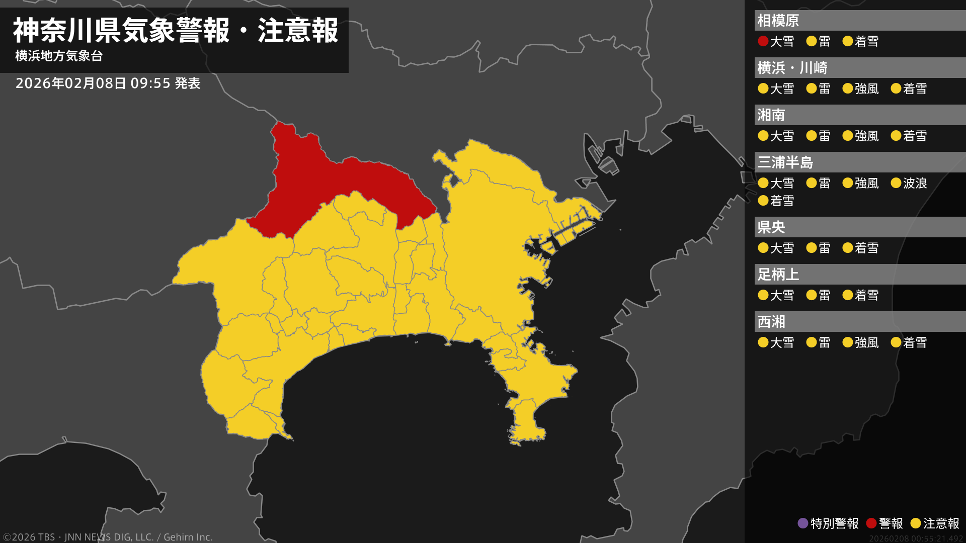 【大雪警報】神奈川県・相模原市に発表 8日09:55時点 TBSテレビ 2026年2月8日(日) 09:55 地震・災害 気象台は、午前9時55分に、大雪警報を相模原市に発表しました。西部では、8日昼過ぎまで大雪に警戒してください。【警報(発表中)と予報値】■相模原市□大雪警報【発表】 積雪 8日昼過ぎにかけて警戒・平地 12時間最大降雪量 10cm