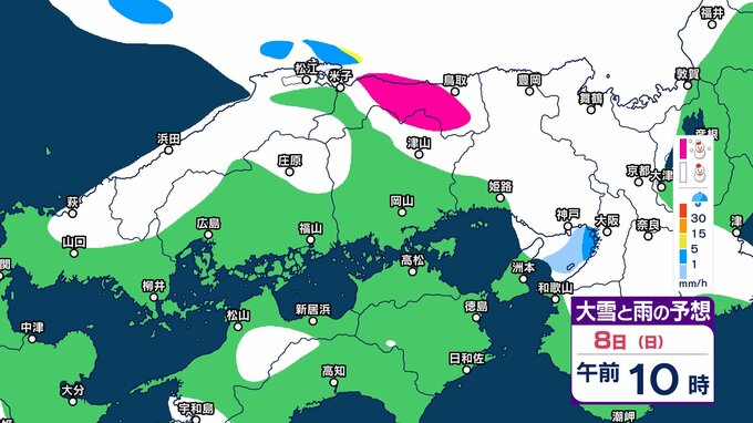 8日6時から9日6時までに予想される24時間降雪量は多い所で、