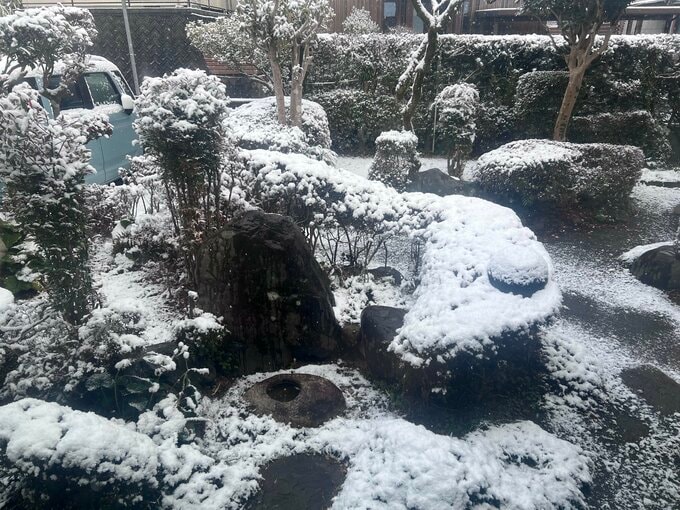 日置市伊集院町で午前8時半ごろに撮影された画像です。庭の木々に雪が積もっています。地面や道路にも雪がうっすらとつもっています。