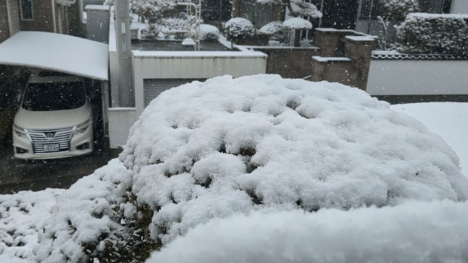 鹿児島市武岡の住宅地では、庭先の木々や屋根に雪が数センチ積もっています。