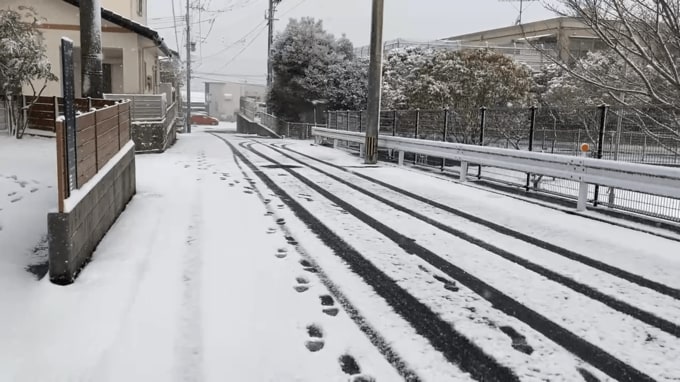 鹿児島市吉野町の住宅街で午前8時半ごろ撮影された画像です。道路には雪が積もっています。車や人が通った跡ができています。