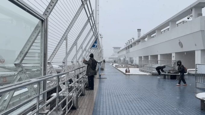 家の前では、雪が足の甲のあたりまで積もっています。