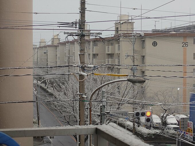 午前8時15分ごろの鹿児島市紫原の様子です。この時点でこの写真の範囲で道路には積雪している様子は確認できませんが、駐車場の車にはフロントガラスや屋根に雪が積もっているのが確認できます。