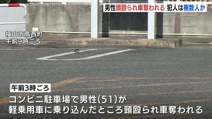 8日未明、福山市で男性が頭などを殴られて車を奪われる強盗傷害事件がありました。逃げた犯人は複数人とみられ、警察が行方を追っています。