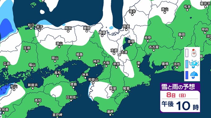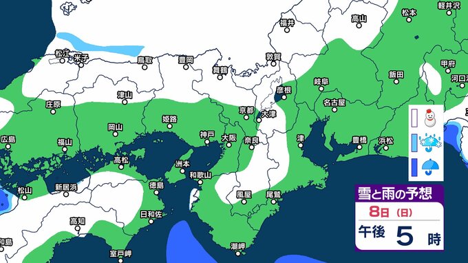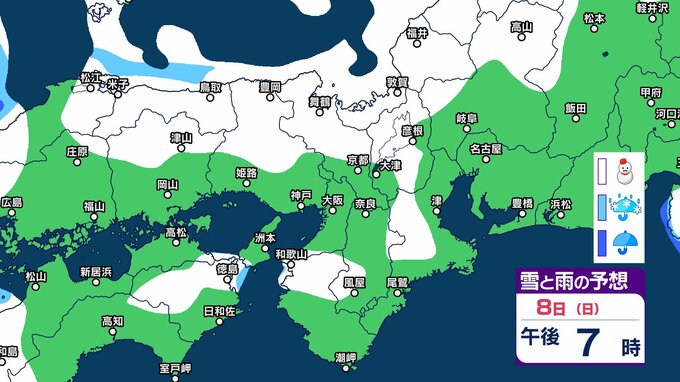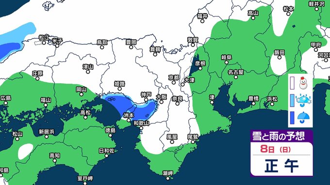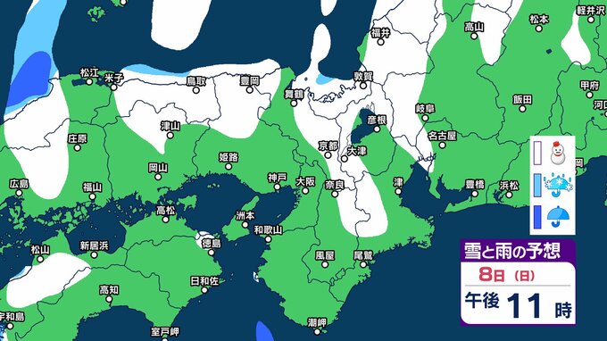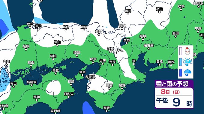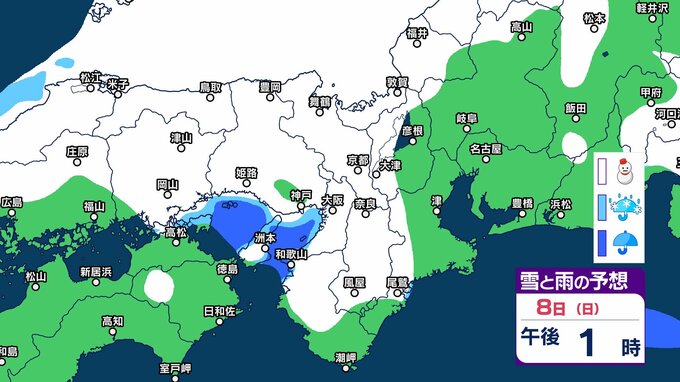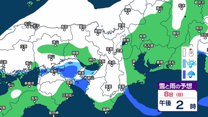 【関西の雪 どうなる?】近畿地方(大阪・京都・兵庫・滋賀・奈良・和歌山)の1時間ごとの雪雨シミュレーションと16日間天気予報「近畿南部平地3センチの予想」【気象庁/2月8日午前11時】 RSK山陽放送 2026年2月8日(日) 11:00 国内 天気 8日(日)午後 気象庁によりますと、近畿地方では、9日明け方にかけて大雪となるでしょう。 特に、8日夜のはじめ頃にかけては短時間に降雪が強まり、警報級の大雪となる見込みだということです。 8日(日)~11日(祝・水)近畿地方の雪雨シミュレーション・16日間天気予報 8日(日)~11日(祝・水)近畿地方の雪雨シミュレーション・16日間天気予報