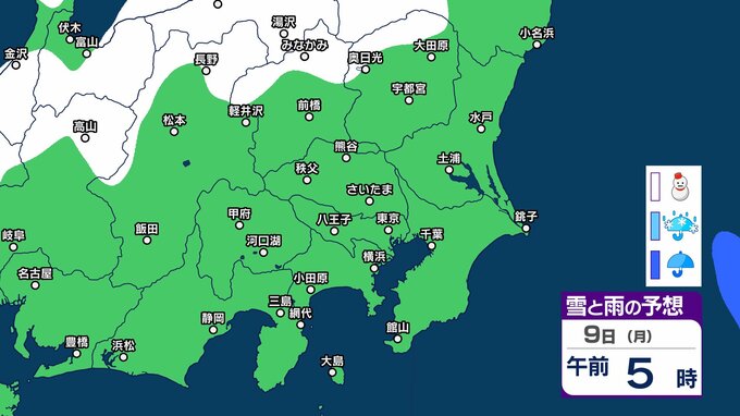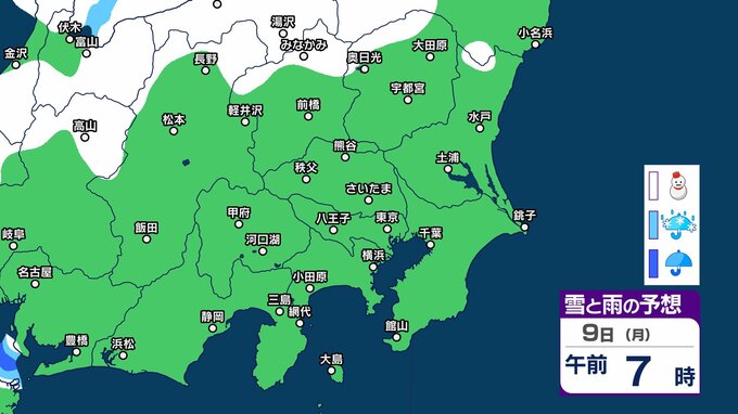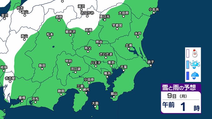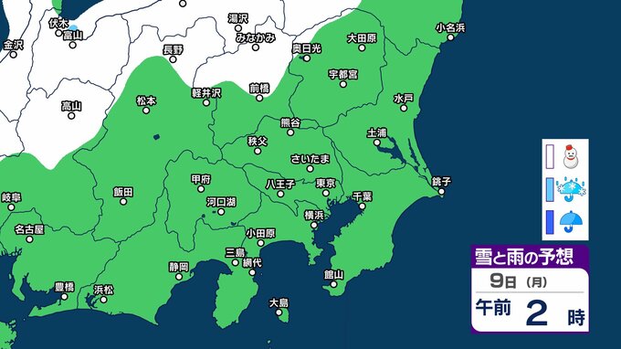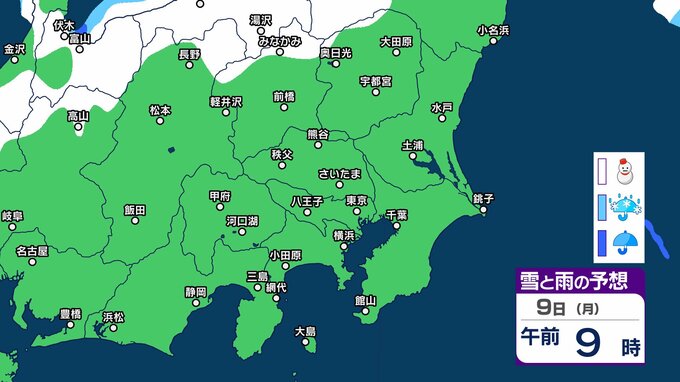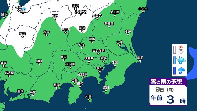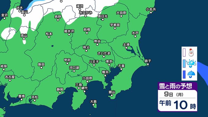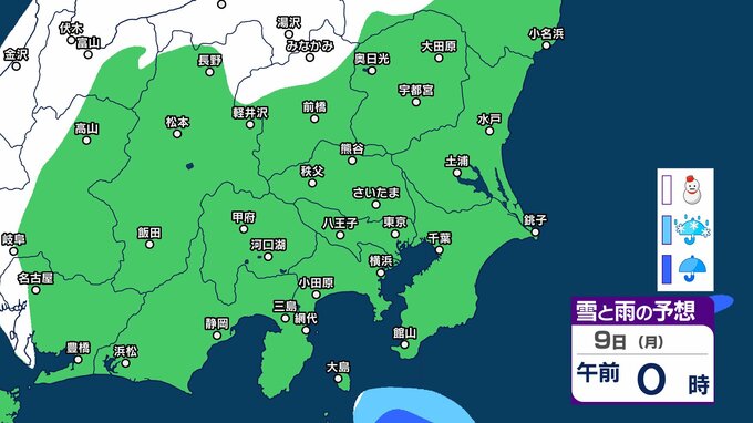 【雪の予想】東京・栃木・群馬・埼玉・茨城・千葉・神奈川・長野・山梨 8日(日)~10日(火)1時間ごとの雪雨シミュレーション「関東地方南部の平地8センチ降雪予想」【気象庁/8日午前11時半】 RSK山陽放送 2026年2月8日(日) 11:30 国内 9日(月) 関東甲信の1時間ごとの雪雨シミュレーション 関東甲信の1時間ごとの雪雨シミュレーション