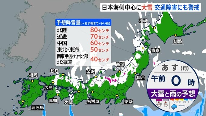 北陸・山陰など日本海側では大雪続く見込み 太平洋側でも夜にかけて雪が強まる地域も 9日午前まで寒気の影響続く見通し TBSテレビ 2026年2月8日(日) 11:55 国内 天気 9日(月)朝までの降雪量 関東など雪が止んでも積雪に注意 あす朝までに予想される雪の量は、北陸で80センチ、近畿で70センチです。 普段雪の少ない太平洋側でも雪が予想されます。 また、関東など雪が止んだ後でも、道路の積雪などに警戒が必要です。